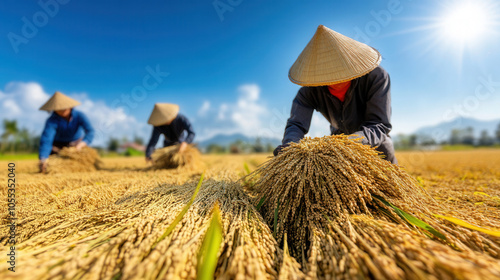 Harvesting rice in sunny field with workers wearing conical hats, showcasing traditional agricultural practices. vibrant landscape highlights beauty of rural life