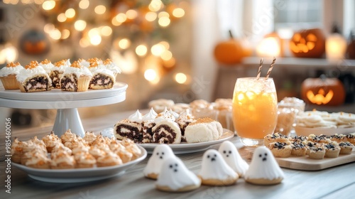Haunted dessert table with spooky brain cakes glowing pumpkin punch