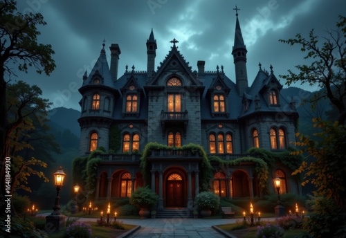 haunted, luxury home, gothic, church steeple, tall, tower, infused, roof, broken, window, jagged, chimney, weathered, wall, overgrown, vine, flickering, dim, candlelight, across, shadowed, courtyard, ai, generative