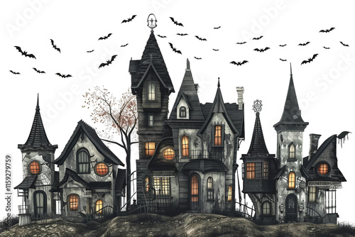 Haunting Halloween Haunted House with Pumpkins Isolated on Transparent Background