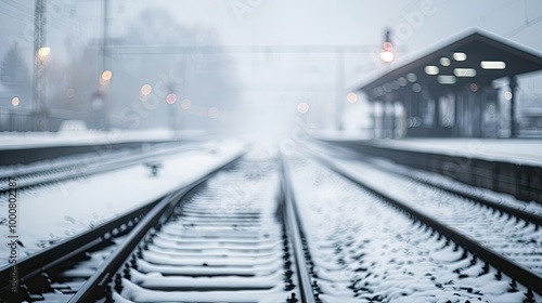 Hazy view of a winter train station with snowy tracks and a chilly sky