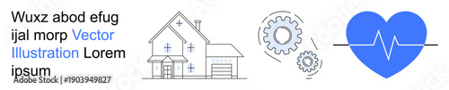 Health care, smart homes, innovation, engineering, technology, safety. A house with gears and heartbeat symbol. Health care and innovation through safety and technology