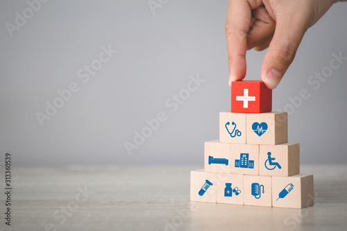 Health Insurance Concept,hand arranging wood block stacking with icon healthcare medical.