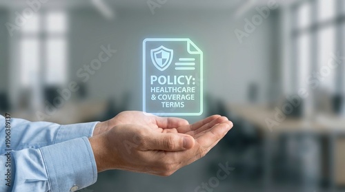 health care, insurance, policy, coverage, medicals, digital, document, protection, security, health, finance, business, hologram, technology, assurance, plan, contract, management, corporate, employee, wellness, patient, hospital, care, safety, support, concept, compliance, trust, modern, office, background, holding, hand, interactive, future, shield, icon, term