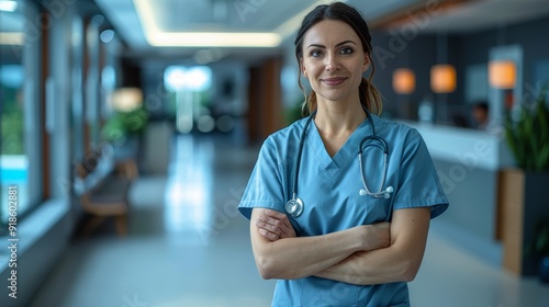 Healthcare professional stands confidently in a modern hospital corridor during daytime