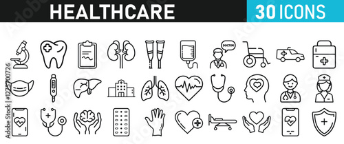 Healthcare set icons for web. Medicine and Health Care linear icon collection. Containing, Stethoscop, emergency, doctor, treatment, medical, report, diagnosis, health, prevention, patient