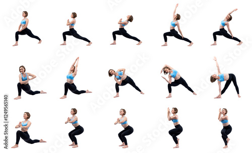 collage, squat, yoga, meditation, set, background, isolated, exercise, sport, fitness, woman, different, fit, athlete, physical, power, athletic, strong, activewear, studio, shot, model, health, energy, gym, active, positive, wellness, body, endurance, strength, full body, physical exercise, training, young, female, person, people, posing, position, variety, difference, leg