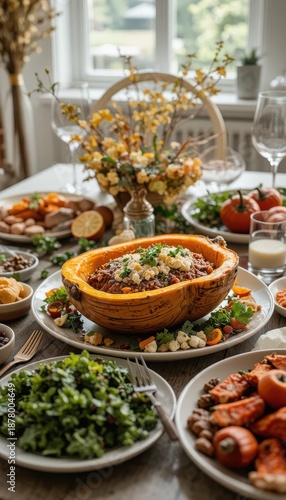 Healthy and colorful plant-based Thanksgiving meal featuring roasted squash and autumn vegetables in a bright, modern setting.