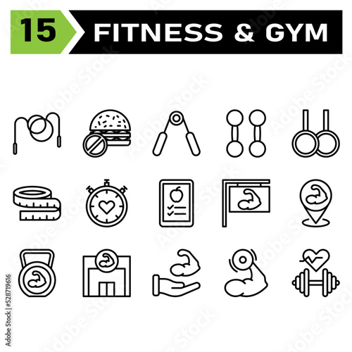 Healthy and fitness icon set include rope, jump, skip, healthy, fitness, gym, burgers, no food, unhealthy, food, diet, gripper, grippers, hand, bodybuilding, lifting, weight, aerobics, exercise