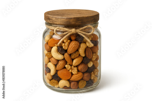 Healthy assorted nuts and dried fruits in a glass jar, isolated subject