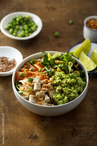 food, salad, bowl, chicken, avocado, poke, pea, tomatoes, olive, mashed, mash, vitamin, cooking, health food, closeup, tomatoes, ingredient, summer, mix, sauce, portion, roasted, colourful, leaf, plate, pepper, poultry, closeup, protein, fresh, healthy, meal, diet, grilled, nourishment, lettuce, white, lunch
