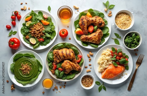 Healthy food assortment on light background. Variety of balanced dishes with vegetables, meat, fish. Concept for menu, nutrition plan, healthy eating. Dishes with vegetables, tomatoes, spinach,