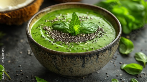 smoothie, bowl, green, healthy, receipe, seed, mint, leaf, nourishment, wellness, food, coconut, natural, ingredient, dietary, snack, vegan, freshness, breakfast, rustic, health, foliage, ambience, organic, creamy, styling, colours, plate, blend, dessert, plant, wholesome, delicious, refreshing, culinary, epicure, choice, alimentary, meal, homemade, energizing, trend, rich, texture