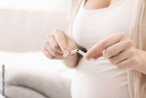 Healthy life choice, stop smoking concept. Pregnant woman breaking cigarette on halves, free space