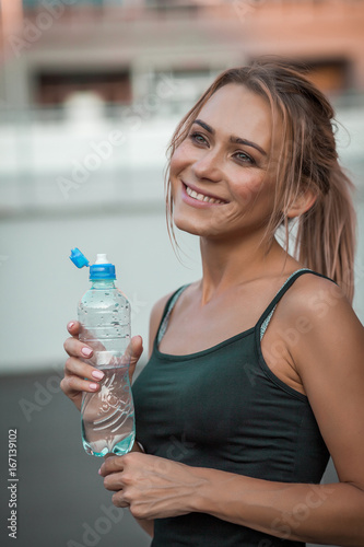 healthy lifestyle young woman runner drinking water while doing her exercise