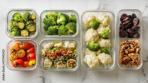 Healthy meal prep containers filled with vibrant vegetables, nuts, and fruits for a balanced diet.