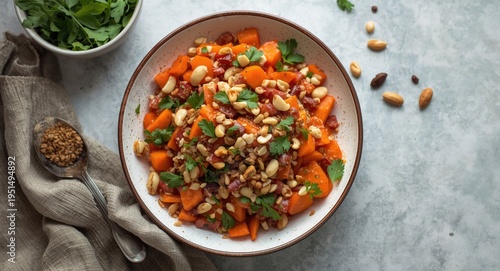 Healthy Moroccan salad bowl featuring fresh carrots and mixed nuts
