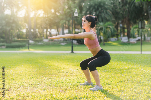 Healthy outdoor lifestyle with fit young Asian woman 30s wearing pink sportswear squat muscles in public park before going for invigorating run, embodying the wellness concept.