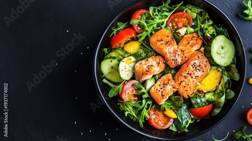 Healthy Salmon Salad Bowl: A vibrant and appetizing overhead view captures a healthy salad bowl with perfectly cooked salmon pieces atop a bed of fresh greens and colorful vegetables.