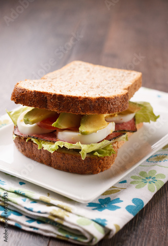 Healthy sandwich with eggs, avocado and vegetables