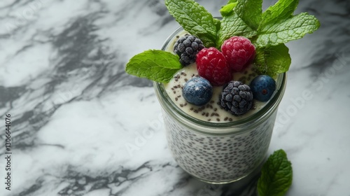 Healthy smoothie with chia seeds, berries, and mint in glass jar on marble surface, vibrant and fresh, ultra-detailed, 8k