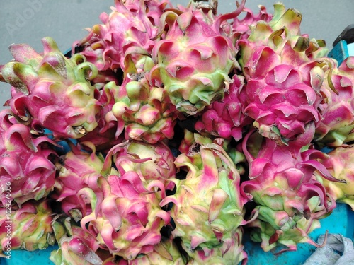 dragon fruit, exotic fruit, tropical, fruit, pink, green, market, display, food, healthy, eating, produce, vibrant, freshness, abundance, closeup, texture, scale, rough, bumpy, delicious, alimentary, vegetarian, vegan