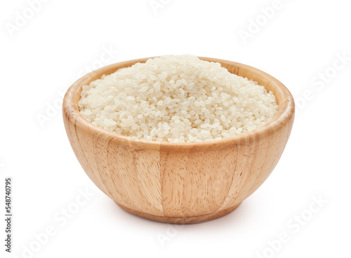 heap of short grain rice in wood bowl isolated on white background. Japonica rice