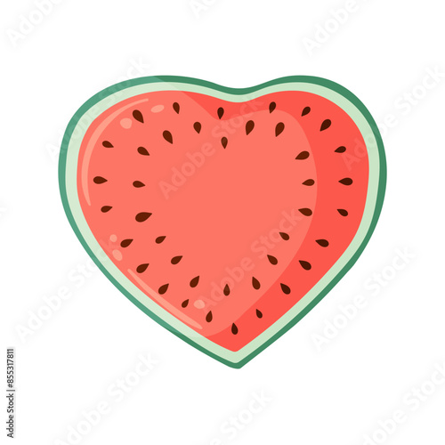 Heart shaped watermelon slice with vibrant green rind and red flesh with black seeds. Flat vector illustration of romantic dessert for Valentines day. Summer fruit for menu, icon, logo, postcard