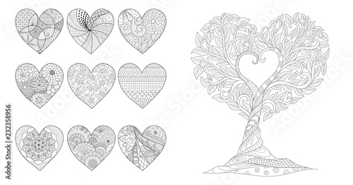heart, vector, illustration, black-and-white, tree, nubes, shape, isolated, doodle, drawing, hand-drawn, floral, flower, set, collection, leaf, leaf, line, adult, children, lace, engraving, artwork, vignetting, cartoon, romance, wedding, anniversary, party, celebration