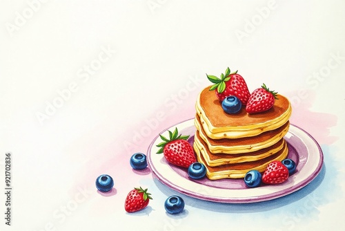 Heart-shaped Pancakes with Fresh Berries in Vibrant Watercolor Style with Copy Space