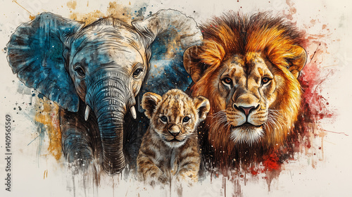 Heartwarming watercolor illustration of elephant with lion family gathering in harmonious zoo nursery scene against textured beige background