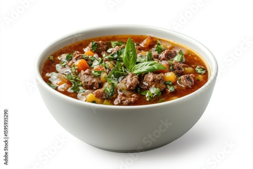 Hearty Beef and Vegetable Soup in White Bowl Isolated on White Background hearty bowl isolated beef