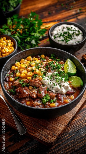 chili, beef, meat, corn, bean, red beans, sour cream, cilantro, lime, bowl, rustic, wooden board, food photography, dinner, lunch, meal, home cooking, comfort food, hearty, spicey, warm, savoury, delicious, homemade, cooking, receipe, culinary, cookery, epicure, tasty, flavorful, stew, party food, closeup, topview, health food, side dish, mexican food