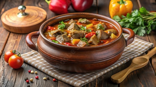 Hearty beef goulash in a large clay pot