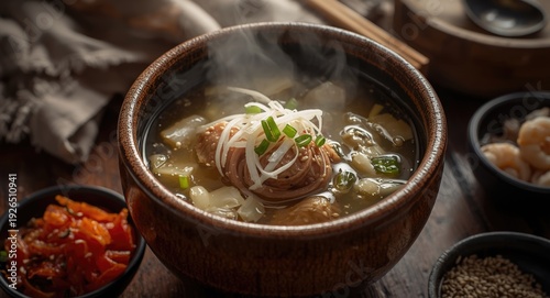 Hearty bone broth based Korean hangover soup in ceramic bowl alongside spicy kkakdugi and salted shrimp