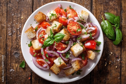 salad, bread, toasted, cube, tomatoes, cherry, red, onion, basil, fresh, healthy, lunch, dinner, vegan, vegetarian, italian, mediterranean, food, delicious, tasty, freshness, colourful, rustic, wooden, plate, white, top, view, dish, meal, cookery, closeup, ingredient, diet, alimentary, easy, simple, homemade, flavorful, summer, spring, picnic, light, nutrient