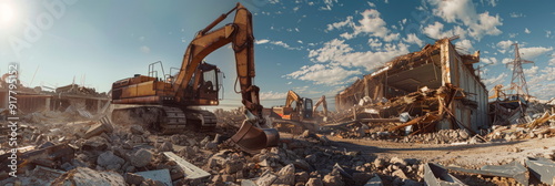 heavy machinery in action, highlighting the raw power and force used to dismantle the structure.