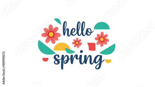 Hello spring typography design surrounded by colorful flowers and abstract shapes for seasonal advertising and festive invitations.