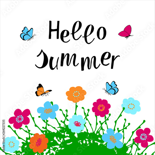 Hello Summer hand drawn lettering phrase with floral compositin on white background. Handwritten calligraphy design for greeting cards, posters, banners, cloth, textile, fabric. Vector illustration