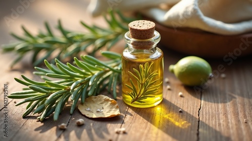 Herbal oil preparation with rosemary on rustic wooden table surrounded by natural elements