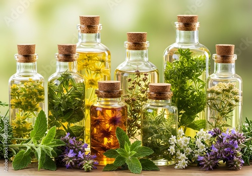 Herbal oils in glass bottles