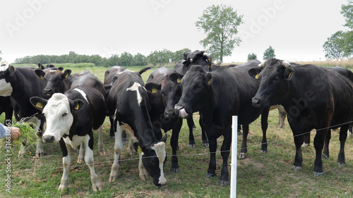 Herd of curious cows at the meadow