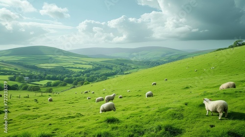 Herd of Sheep Grazing on Lush Green Hillside, St Patrick Day