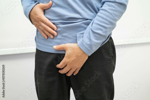 Hernia, Asian man stomach ache, abdominal pain and urology problem health.