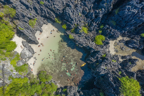 Hidden lagoon with rocky coast and azure tropical sea in El Nido, Palawan, Philippines. Hidden paradise on Blue Lagoon. Aerial drone view.