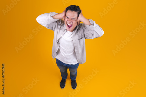 High Angle Shot of Young Male Hold His Head and Scream in Frustration Over Yellow Background