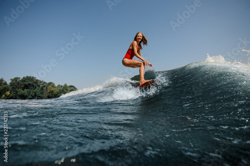 High blue wave on a foreground and young blonde woman wakesurfing on board