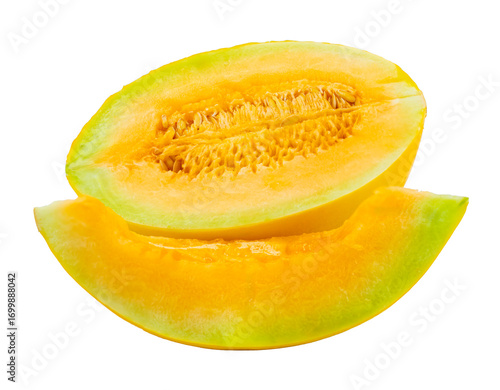 High Quality PNG Picture of orange honeydew melon melon: half and slice on white background