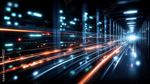 High speed data streams inside a server corridor representing network infrastructure data transfer and digital connectivity.