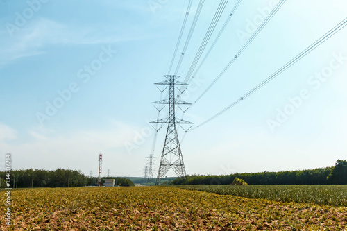 voltage, high, tower, electricity, blue, electric, transmission, metal, line, power, cloud, background, steel, nature, dusk, yellow, tower, environment, field, energy, industry, network, engineering, landscape, cable, sky, green, technology, high voltage, industrial, equipment